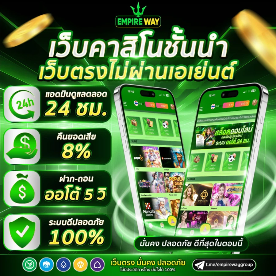 EmpireWay เว็บพนันออนไลน์ที่รวบรวมเกมพนันครบวงจร ให้บริการด้วยระบบที่ทันสมัยและปลอดภัย พร้อมระบบฝาก-ถอนอัตโนมัติที่รวดเร็วตลอด 24 ชั่วโมง ด้วยประสบการณ์การให้บริการมากกว่า 5 ปี จึงได้รับความไว้วางใจจากนักพนันทั่วเอเชีย มาพร้อมเกมคาสิโนยอดนิยมจากค่ายดังระดับโลก ทั้งสล็อต บาคาร่า รูเล็ต ไฮโล และกีฬาต่างๆ ให้เลือกเดิมพันมากมาย รองรับการเล่นผ่านทั้งคอมพิวเตอร์และมือถือ พร้อมโปรโมชั่นสุดคุ้มที่มอบให้สมาชิกทั้งเก่าและใหม่ตลอดทั้งปี ตอบโจทย์ความต้องการของนักพนันยุคใหม่ที่ต้องการความสะดวกสบายในการเดิมพันออนไลน์อย่างครบครัน