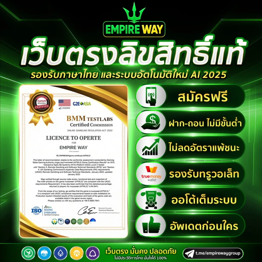 สำหรับผู้ที่กำลังมองหาเว็บพนันที่ทันสมัย ปลอดภัย และให้บริการครบวงจร EmpireWay คือคำตอบที่ใช่ ด้วยการผสมผสานระหว่างเทคโนโลยีล้ำสมัย ความหลากหลายของเกม และการบริการที่เป็นมิตร ทำให้ EmpireWay กลายเป็นทางเลือกที่น่าสนใจสำหรับนักพนันยุคดิจิทัลอย่างแท้จริง